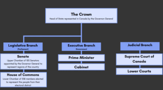 The Prime Minister (PM) is the head of government and the most powerful political figure. They are responsible for leading the executive branch and making policy decisions. They are usually the leader of the political party that wins the most seats in the House of Commons after a federal election.